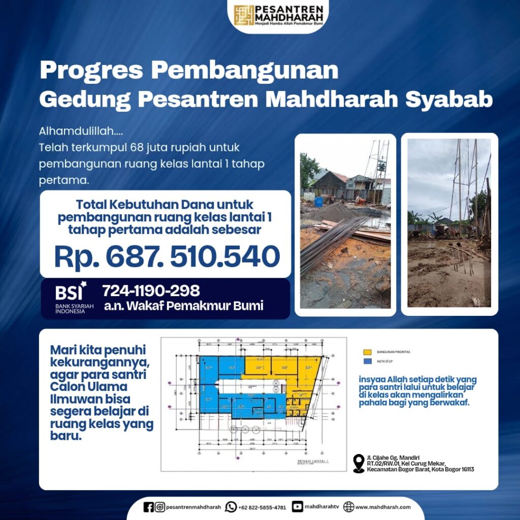 Insyaa Allah saat ini Pondok Pesantren Mahdharah Lanjutan Syabab sedang melakukan pembangunan, mohon doa dan dukungan terbaik dari kaum muslimin sekalian. Berikut rencana pembangunan Pondok Pesantren Mahdharah Lanjutan Syabab.